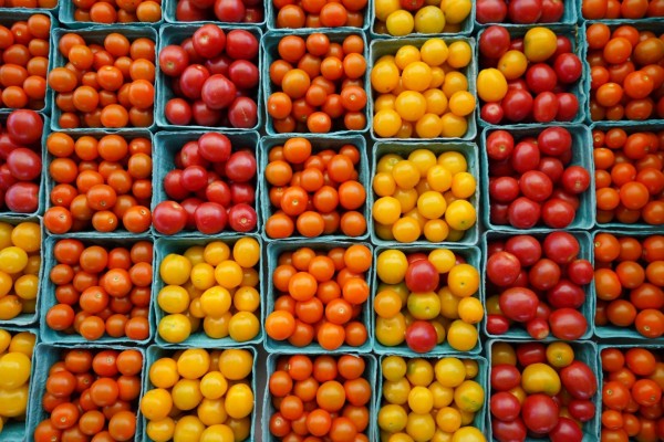 At TTCF, farmers grow several varieties of cherry tomatoes in their unheated hoop houses. Sungolds are the earliest variety and are the harbingers of summer. They are arguably the sweetest and most beloved variety the farmers grow. Other cherry tomato varieties grown at TTCF include the dark pink Sun Peach tomatoes and the sweet yellow Esterina tomatoes along with the slightly larger, striped Sunrise Bumblebee and Pink Bumblebee tomatoes.