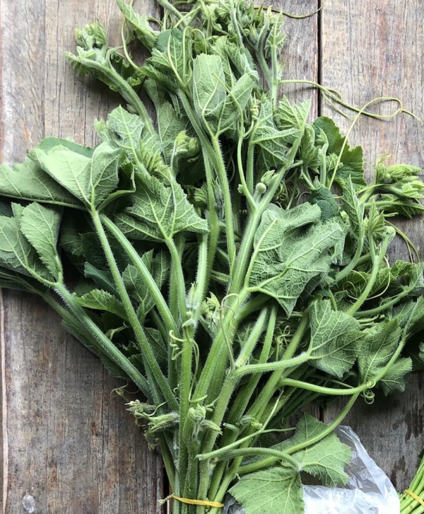 Did you know that you can eat pumpkin shoots?! It turns out that throughout much of Asia and Africa, people prize the young leaves and tendrils of pumpkin vines. When raw, they are covered in a pretty thick fuzz, so it’s hard to imagine eating them, but if you’re willing to take a few minutes of prep time, they’re a delicious and unusual treat.