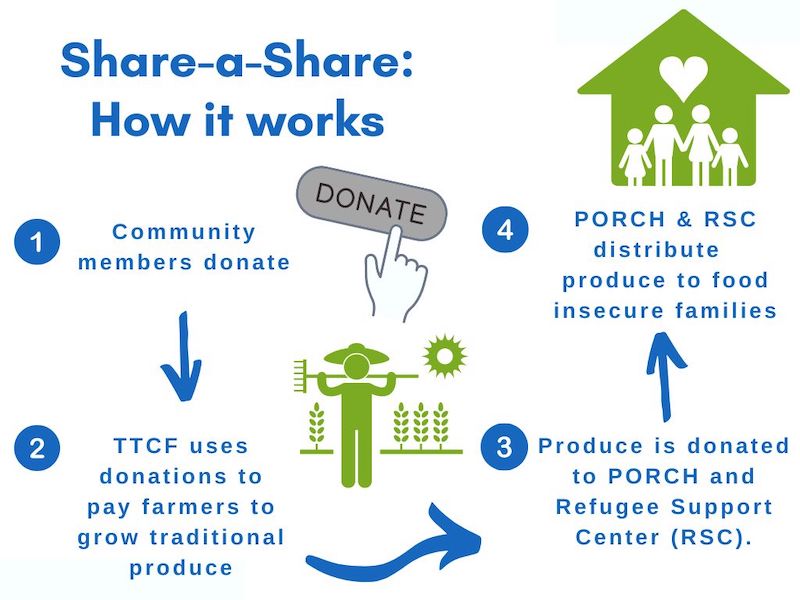 Please donate to help this project grow! Currently, PORCH and RSC distribute produce from TTCF farmers to over 200 refugee families per month. 100% of donations to Share a Share go directly toward paying farmers for their produce which is then donated to refugee families.